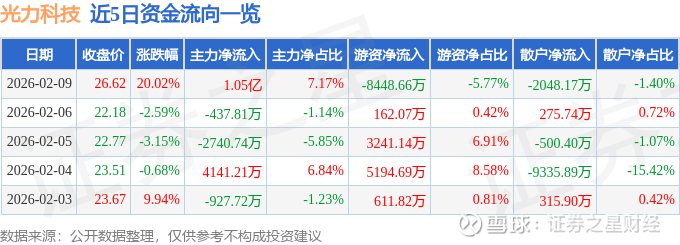 证券之星消息,光力科技2月9日涨停收盘,收盘价26.62元。该股于13点24分涨停,2次打开涨停,截止收盘封单资金为3891.41万元,占其流通市值0.59%。