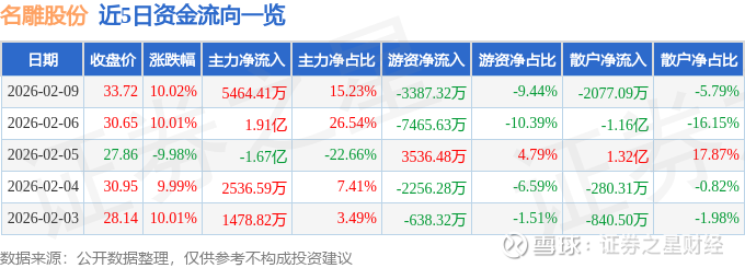 2月9日的资金流向数据方面,主力资金净流入5464.41万元,占总成交额15.23%,游资资金净流出3387.32万元,占总成交额9.44%,散户资金净流出2077.09万元,占总成交额5.79%。