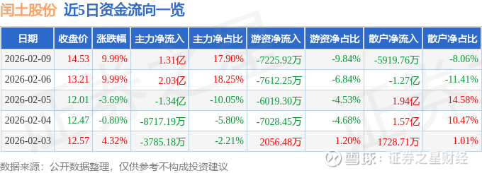 证券之星消息,闰土股份2月9日涨停收盘,收盘价14.53元。该股于9点32分涨停,未打开涨停,截止收盘封单资金为5994.02万元,占其流通市值0.44%。