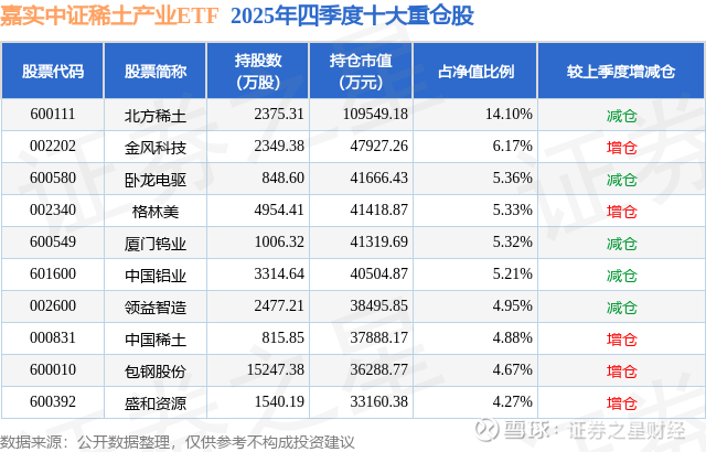 嘉实中证稀土产业ETF的前十大重仓股如下: