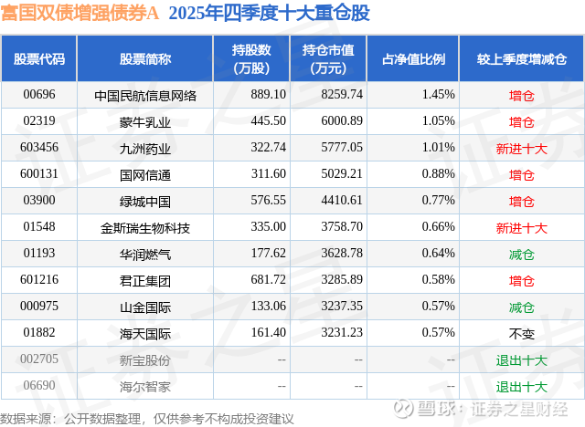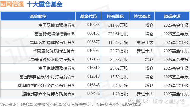 根据2025基金年报公募基金重仓股数据,重仓该股的公募基金共9家,其中持有数量最多的公募基金为富国基金的富国双债增强债券A。富国双债增强债券A目前规模为27.31亿元,最新净值1.168(2月6日),较上一交易日上涨0.01%,近一年上涨8.98%。该公募基金现任基金经理为俞晓斌。俞晓斌在任的基金产品包括:富国泰利定开债发起式,管理时间为2016年12月30日至今,期间收益率为49.68%;富国两年期理财债券A,管理时间为2018年12月14日至今,期间收益率为24.13%;富国稳健增强债券A/B,管理时间为2019年3月13日至今,期间收益率为33.49%;富国天盈债券(LOF)C,管理时间为2019年3月13日至今,期间收益率为28.07%。