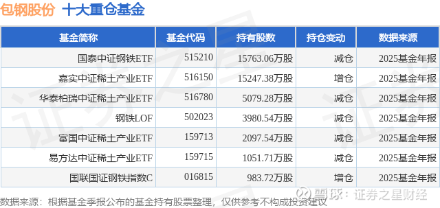 根据2025基金年报公募基金重仓股数据,重仓该股的公募基金共7家,其中持有数量最多的公募基金为国泰基金的国泰中证钢铁ETF。国泰中证钢铁ETF目前规模为39.8亿元,最新净值1.4975(2月6日),较上一交易日下跌0.37%,近一年上涨33.82%。该公募基金现任基金经理为吴中昊。吴中昊在任的基金产品包括:国泰中证500指数增强A,管理时间为2022年1月28日至今,期间收益率为41.16%;国泰中证内地运输主题ETF,管理时间为2022年11月30日至今,期间收益率为-0.6%;国泰沪深300指数增强A,管理时间为2022年12月30日至今,期间收益率为21.79%;国泰国证新能源汽车指数C,管理时间为2022年12月30日至今,期间收益率为14.66%。