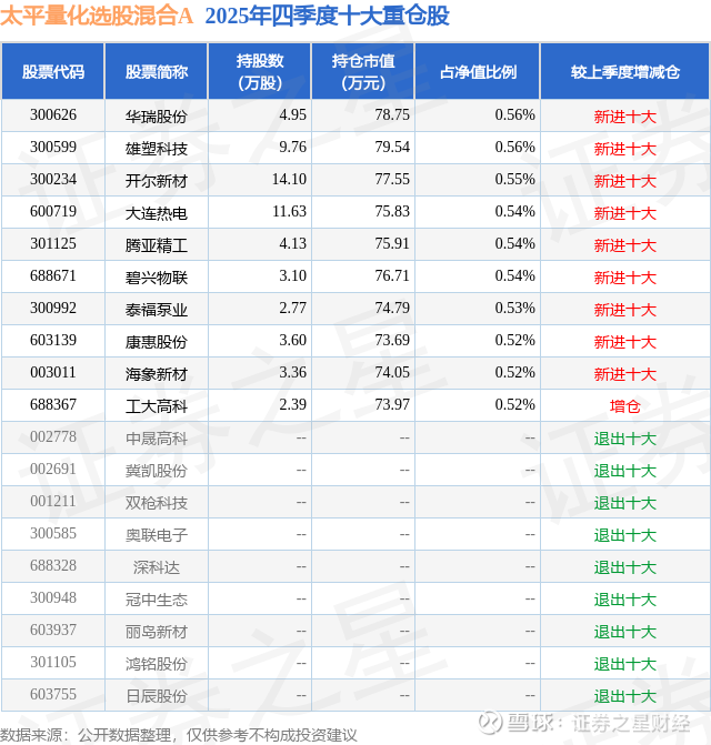 太平量化选股混合A的前十大重仓股如下: