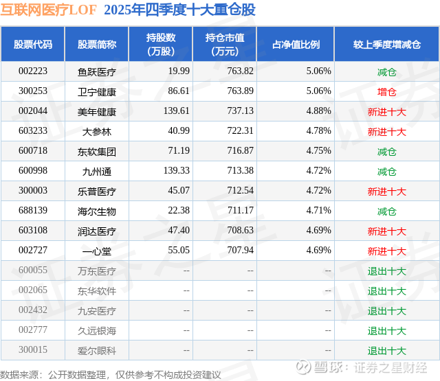 根据2025基金年报公募基金重仓股数据,重仓该股的公募基金共1家,其中持有数量最多的公募基金为汇添富基金的互联网医疗LOF。互联网医疗LOF目前规模为0.63亿元,最新净值0.9943(2月6日),较上一交易日下跌1.11%,近一年上涨17.65%。该公募基金现任基金经理为吴振翔。吴振翔在任的基金产品包括:汇添富上证综合指数A,管理时间为2010年2月6日至今,期间收益率为95.74%;汇添富沪深300安中指数A,管理时间为2013年11月6日至今,期间收益率为206.42%;汇添富中证精准医疗指数(LOF)C,管理时间为2016年1月21日至今,期间收益率为-2.35%;汇添富中证上海国企ETF,管理时间为2016年7月28日至今,期间收益率为6.68%。