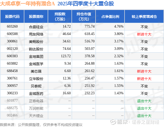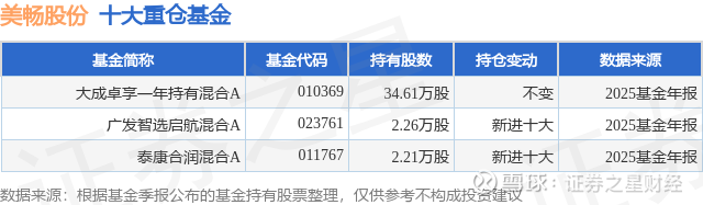 根据2025基金年报公募基金重仓股数据,重仓该股的公募基金共3家,其中持有数量最多的公募基金为大成基金的大成卓享一年持有混合A。大成卓享一年持有混合A目前规模为1.46亿元,最新净值1.1778(2月6日),较上一交易日下跌0.08%,近一年上涨12.32%。该公募基金现任基金经理为苏秉毅。苏秉毅在任的基金产品包括:大成核心双动力混合A,管理时间为2016年3月4日至今,期间收益率为101.32%;大成景恒混合A,管理时间为2018年6月26日至今,期间收益率为278.77%;大成丰享回报混合A,管理时间为2024年1月29日至今,期间收益率为16.25%。