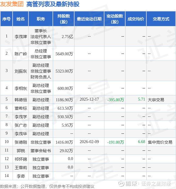 友发集团的高管列表及最新持股情况如下: