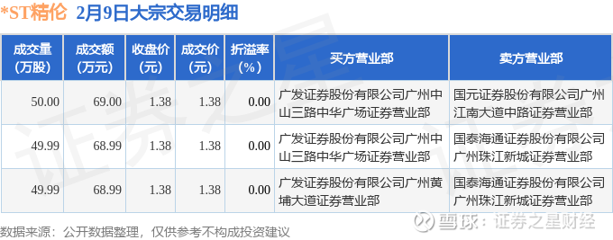 证券之星消息,2月9日*ST精伦发生大宗交易,交易数据如下: