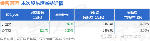 证券之星消息,2月9日睿智医药发布公告《睿智医药:关于持股5%以上股东减持至5%以下暨权益变动的提示性公告》,其股东于显文、梁玉凤于2026年2月6日合计减持138.94万股,占公司目前总股本的0.2791%,变动期间该股股价下跌0.46%,截止2月6日收盘报10.85元。