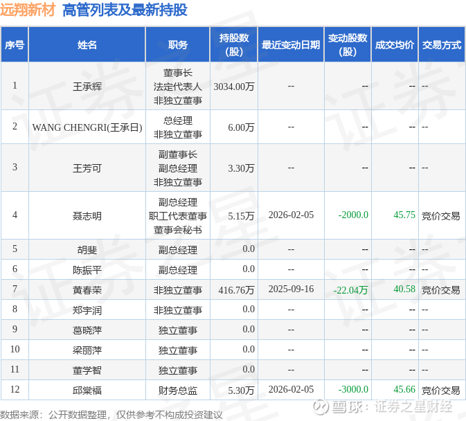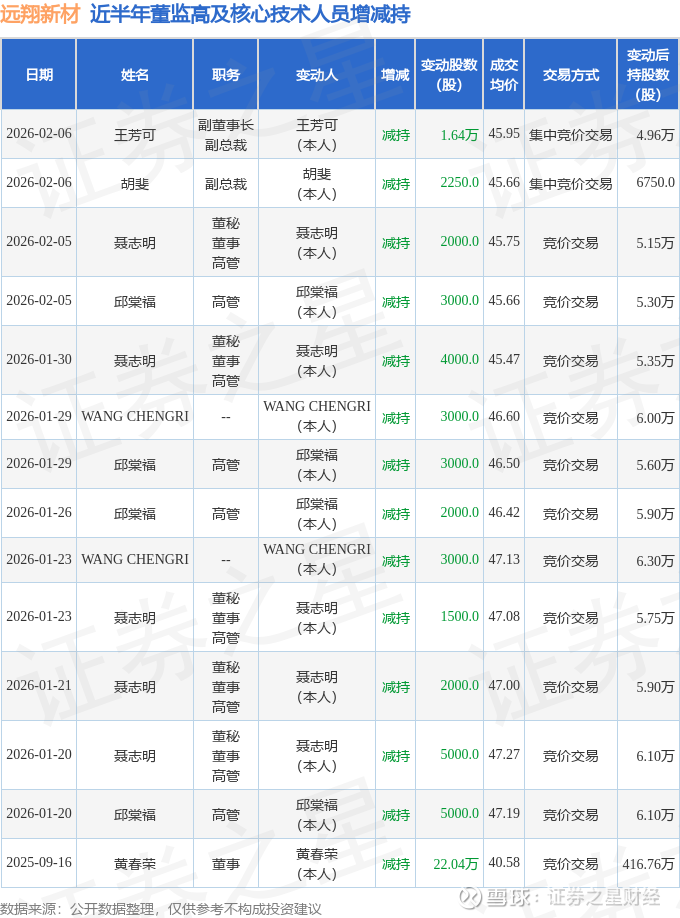 远翔新材近半年内的董监高及核心技术人员增减持详情如下: