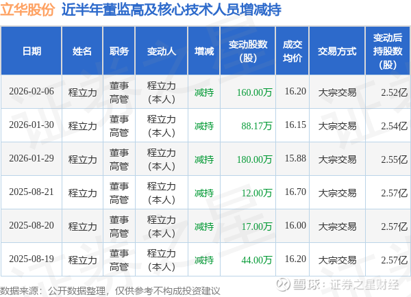 立华股份近半年内的董监高及核心技术人员增减持详情如下: