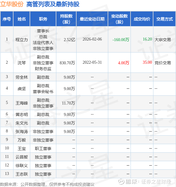 立华股份的高管列表及最新持股情况如下: