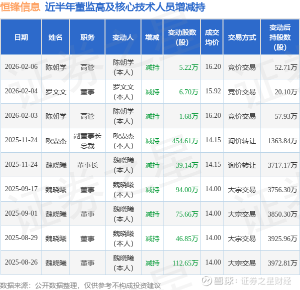 恒锋信息近半年内的董监高及核心技术人员增减持详情如下: