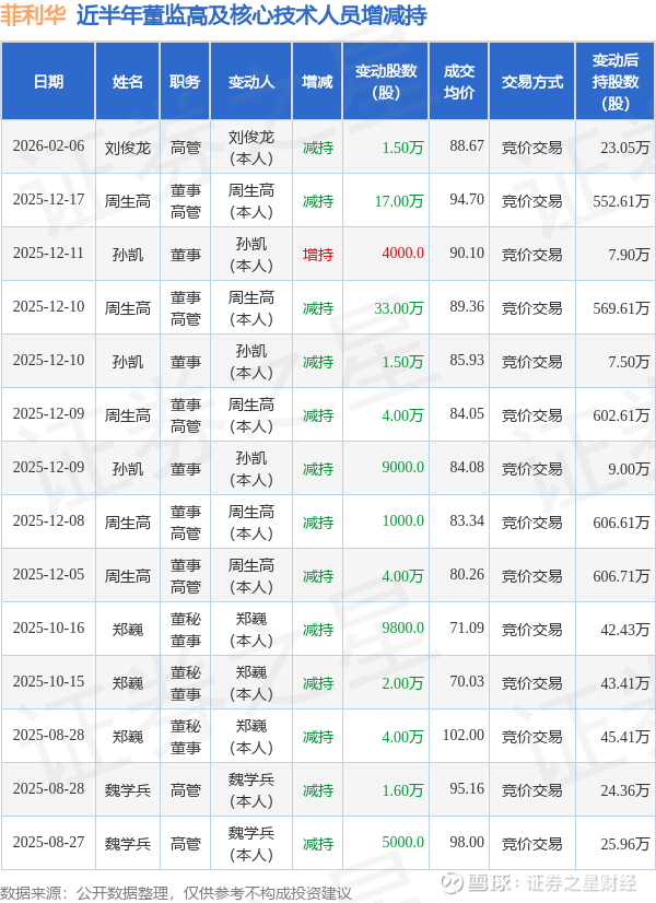 菲利华近半年内的董监高及核心技术人员增减持详情如下: