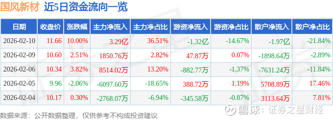 证券之星消息,国风新材2月10日涨停收盘,收盘价11.66元。该股于9点47分涨停,1次打开涨停,截止收盘封单资金为1.38亿元,占其流通市值1.32%。