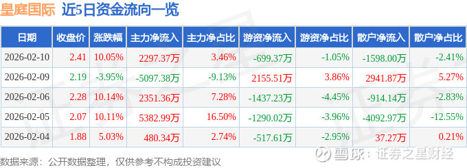 证券之星消息,皇庭国际2月10日涨停收盘,收盘价2.41元。该股于9点38分涨停,9次打开涨停,截止收盘封单资金为897.6万元,占其流通市值0.41%。