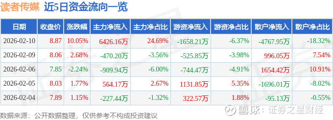 证券之星消息,读者传媒2月10日涨停收盘,收盘价8.87元。该股于10点20分涨停,未打开涨停,截止收盘封单资金为4720.58万元,占其流通市值0.92%。