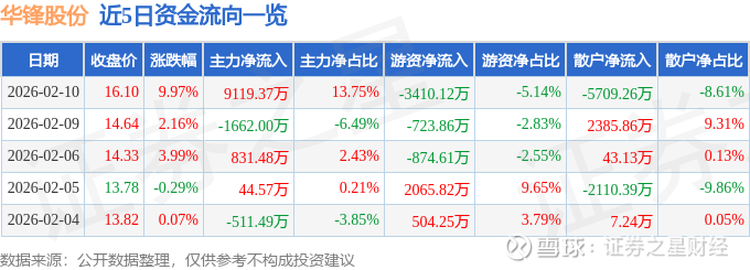 证券之星消息,华锋股份2月10日涨停收盘,收盘价16.1元。该股于9点31分涨停,3次打开涨停,截止收盘封单资金为526.2万元,占其流通市值0.19%。
