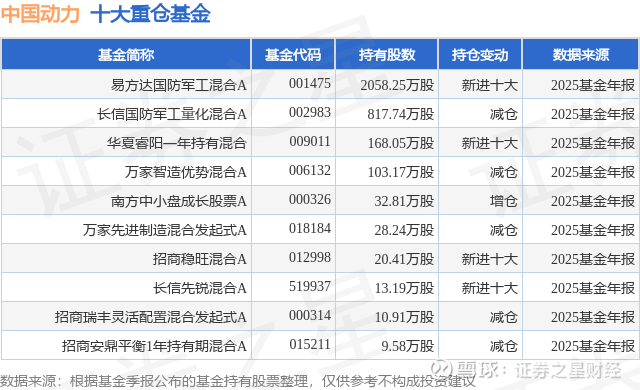 重仓中国动力的前十大公募基金请见下表:
