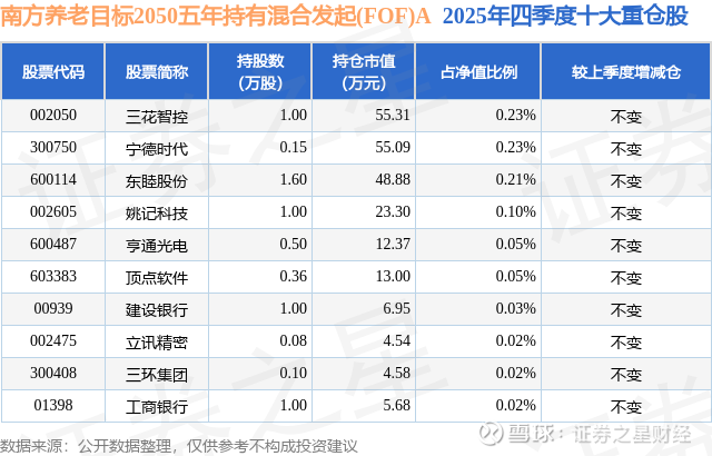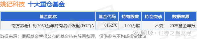 根据2025基金年报公募基金重仓股数据,重仓该股的公募基金共1家,其中持有数量最多的公募基金为南方基金的南方养老目标2050五年持有混合发起(FOF)A。南方养老目标2050五年持有混合发起(FOF)A目前规模为2.33亿元,最新净值1.0512(2月5日),较上一交易日下跌0.32%,近一年上涨13.32%。该公募基金现任基金经理为鲁炳良。鲁炳良在任的基金产品包括:南方养老2035三年持有混合(FOF)A,管理时间为2018年12月21日至今,期间收益率为71.4%;南方养老目标2030三年持有混合发起(FOF)A,管理时间为2019年12月3日至今,期间收益率为36.73%;南方养老2040三年持有混合发起(FOF)A,管理时间为2020年7月29日至今,期间收益率为19.11%;