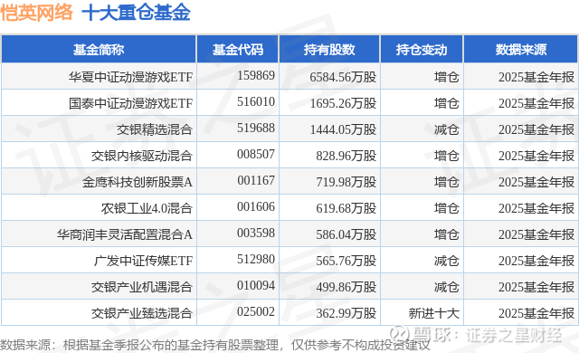 根据2025基金年报公募基金重仓股数据,重仓该股的公募基金共197家,其中持有数量最多的公募基金为华夏基金的华夏中证动漫游戏ETF。华夏中证动漫游戏ETF目前规模为126.11亿元,最新净值1.5817(2月9日),较上一交易日上涨2.72%,近一年上涨39.1%。该公募基金现任基金经理为鲁亚运。鲁亚运在任的基金产品包括:华夏创业板成长ETF联接A,管理时间为2022年6月10日至今,期间收益率为-1.22%;华夏中证全指证券公司ETF联接A,管理时间为2022年6月10日至今,期间收益率为27.7%;华夏国证疫苗与生物科技指数发起A,管理时间为2022年9月6日至今,期间收益率为-33.55%;华夏战略新兴成指ETF联接A,管理时间为2023年3月27日至今,期间收益率为30.38%。