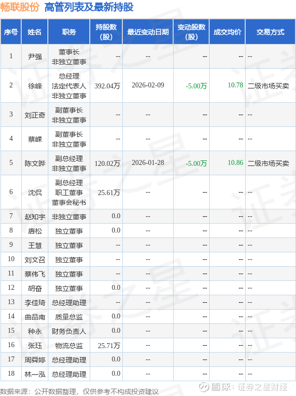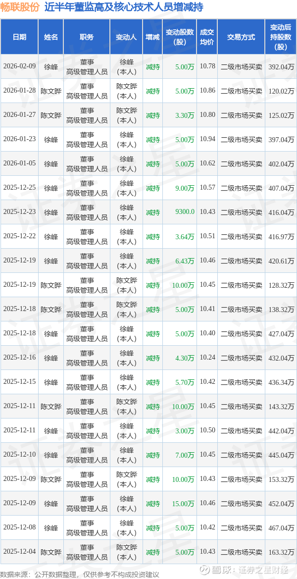 证券之星消息,根据2月10日市场公开信息、上市公司公告及交易所披露数据整理,畅联股份(603648)最新董监高及相关人员股份变动情况:2026年2月9日公司董事,高级管理人员徐峰共减持公司股份5.0万股,占公司总股本为0.0138%。变动期间公司股价上涨0.09%,2月9日当日收盘报10.78元。