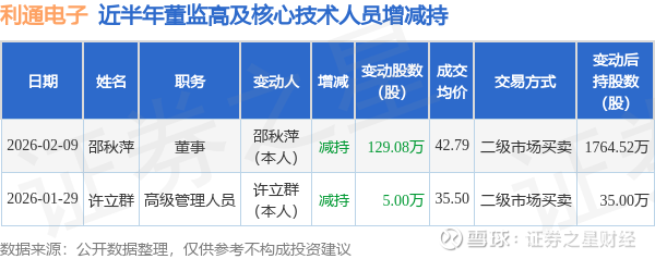 证券之星消息,根据2月10日市场公开信息、上市公司公告及交易所披露数据整理,利通电子(603629)最新董监高及相关人员股份变动情况:2026年2月9日公司董事邵秋萍共减持公司股份129.08万股,占公司总股本为0.492%。变动期间公司股价上涨10.0%,2月9日当日收盘报50.61元。