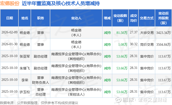 宏德股份近半年内的董监高及核心技术人员增减持详情如下: