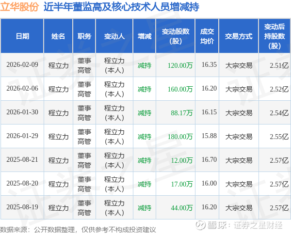 立华股份近半年内的董监高及核心技术人员增减持详情如下: