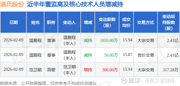 证券之星消息,根据2月10日市场公开信息、上市公司公告及交易所披露数据整理,温氏股份(300498)最新董监高及相关人员股份变动情况:2026年2月9日公司董事温鹏程共减持公司股份1900.0万股,占公司总股本为0.2855%。变动期间公司股价上涨0.38%,2月9日当日收盘报15.88元。