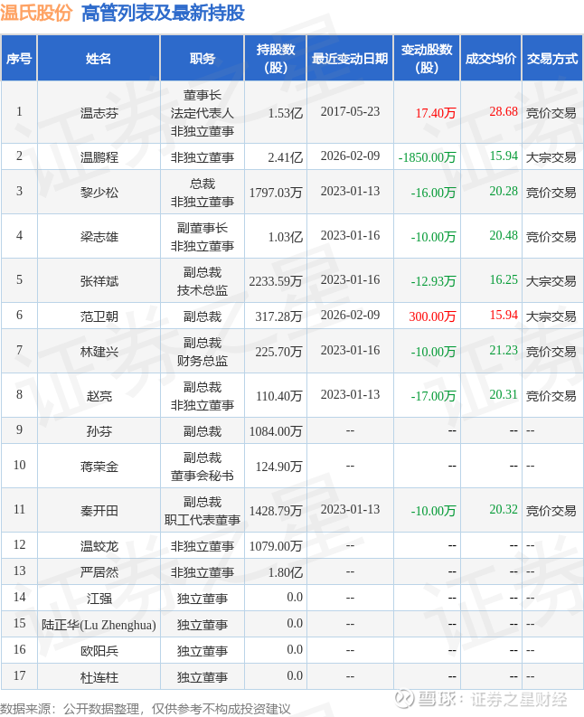温氏股份的高管列表及最新持股情况如下: