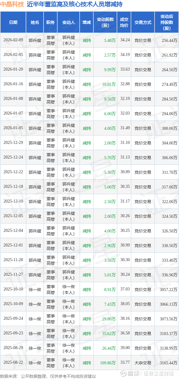 中晶科技近半年内的董监高及核心技术人员增减持详情如下: