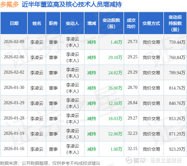 证券之星消息,根据2月10日市场公开信息、上市公司公告及交易所披露数据整理,多氟多(002407)最新董监高及相关人员股份变动情况:2026年2月9日公司董事李凌云共减持公司股份1.4万股,占公司总股本为0.0012%。变动期间公司股价上涨0.07%,2月9日当日收盘报29.76元。