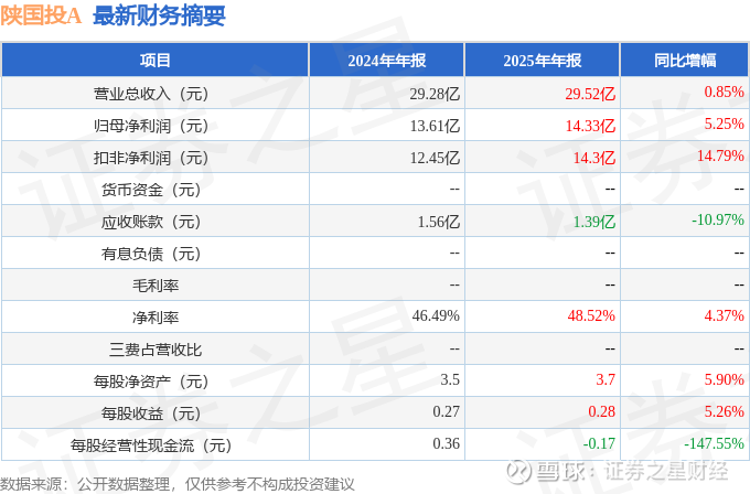 据证券之星公开数据整理,近期陕国投A(000563)发布2025年年报。根据财报显示,陕国投A营收净利润同比双双增长。截至本报告期末,公司营业总收入29.52亿元,同比上升0.85%,归母净利润14.33亿元,同比上升5.25%。按单季度数据看,第四季度营业总收入7.91亿元,同比下降13.16%,第四季度归母净利润4.37亿元,同比上升2.31%。