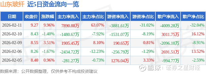 证券之星消息,山东玻纤2月11日涨停收盘,收盘价9.27元。该股于9点30分涨停,未打开涨停,截止收盘封单资金为6003.04万元,占其流通市值1.08%。
