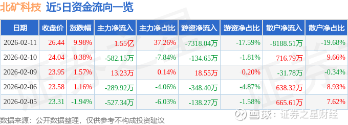 证券之星消息,北矿科技2月11日涨停收盘,收盘价26.44元。该股于10点23分涨停,未打开涨停,截止收盘封单资金为2908.4万元,占其流通市值0.59%。