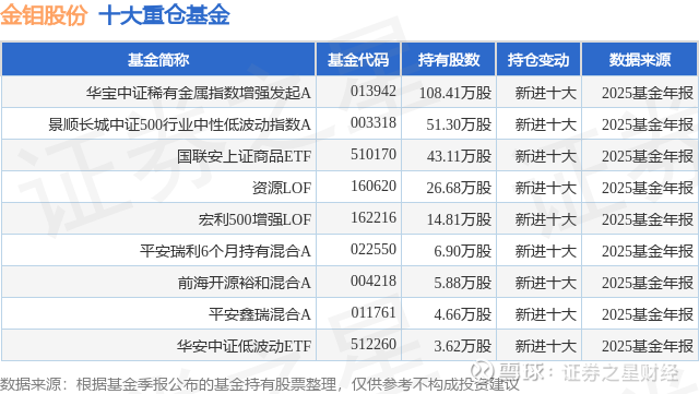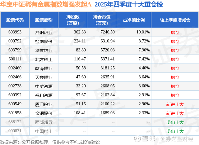根据2025基金年报公募基金重仓股数据,重仓该股的公募基金共9家,其中持有数量最多的公募基金为华宝基金的华宝中证稀有金属指数增强发起A。华宝中证稀有金属指数增强发起A目前规模为2.12亿元,最新净值1.167(2月10日),较上一交易日上涨0.0%,近一年上涨98.71%。该公募基金现任基金经理为王正。王正在任的基金产品包括:华宝量化对冲混合A,管理时间为2020年1月2日至今,期间收益率为8.75%;华宝沪深300增强策略ETF发起式联接A,管理时间为2020年1月2日至今,期间收益率为40.86%;华宝创业板综合增强策略ETF,管理时间为2025年8月20日至今,期间收益率为18.54%;华宝科技先锋混合A,管理时间为2025年8月23日至今,期间收益率为15.24%。