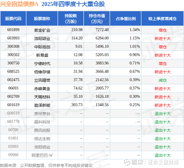 根据2025基金年报公募基金重仓股数据,重仓该股的公募基金共4家,其中持有数量最多的公募基金为兴证全球基金的兴全招益债券A。兴全招益债券A目前规模为33.34亿元,最新净值1.1305(2月10日),较上一交易日上涨0.03%,近一年上涨5.66%。该公募基金现任基金经理为徐留明 斯子文。徐留明在任的基金产品包括:兴全恒益债券A,管理时间为2021年12月20日至今,期间收益率为15.12%;兴全汇享一年持有混合A,管理时间为2023年1月4日至今,期间收益率为16.74%;兴全竞争优势混合A,管理时间为2024年8月27日至今,期间收益率为25.5%。斯子文在任的基金产品包括:兴全恒荣债券A,管理时间为2024年6月25日至今,期间收益率为3.45%;兴全兴益债券A,管理时间为2025年10月29日至今,期间收益率为2.59%。