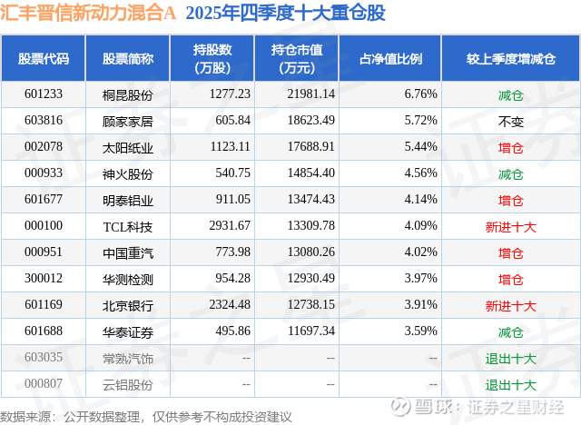 汇丰晋信新动力混合A的前十大重仓股如下: