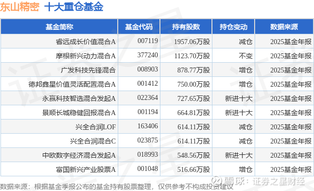 重仓东山精密的前十大公募基金请见下表: