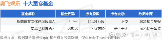 根据2025基金年报公募基金重仓股数据,重仓该股的公募基金共2家,其中持有数量最多的公募基金为招商基金的招商体育文化休闲股票A。招商体育文化休闲股票A目前规模为1.83亿元,最新净值2.437(2月10日),较上一交易日上涨5.64%,近一年上涨44.89%。该公募基金现任基金经理为文仲阳。文仲阳在任的基金产品包括:招商丰盈积极配置混合A,管理时间为2024年3月12日至今,期间收益率为27.42%。