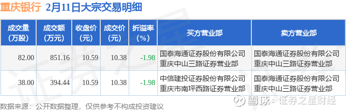 证券之星消息,2月11日重庆银行发生大宗交易,交易数据如下: