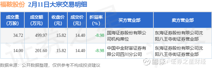 证券之星消息,2月11日福鞍股份发生大宗交易,交易数据如下:
