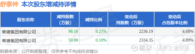 证券之星消息,2月11日舒泰神发布公告《舒泰神:关于原持股5%以上股东减持计划实施完毕的公告》,其股东香塘集团有限公司于2026年1月7日至2026年2月10日间合计减持148.16万股,占公司目前总股本的0.3102%,变动期间该股股价下跌4.65%,截止2月10日收盘报27.5元。
