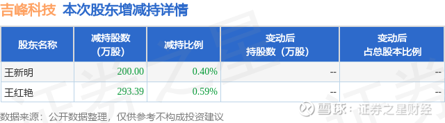 证券之星消息,2月11日吉峰科技发布公告《吉峰科技:关于5%以上股东减持股份比例触及1%整数倍暨减持计划期限届满的公告》,其股东王新明、王红艳于2025年11月17日至2026年2月10日间合计减持493.39万股,占公司目前总股本的0.9983%,变动期间该股股价下跌4.84%,截止2月10日收盘报8.25元。