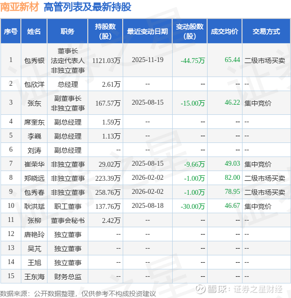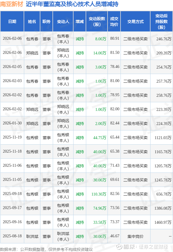 证券之星消息,根据2月11日市场公开信息、上市公司公告及交易所披露数据整理,南亚新材(688519)最新董监高及相关人员股份变动情况:2026年2月6日公司董事郑晓远、董事包秀春共减持公司股份22.0万股,占公司总股本为0.0937%。变动期间公司股价上涨3.71%,2月6日当日收盘报81.03元。