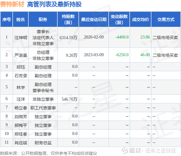 证券之星消息,根据2月11日市场公开信息、上市公司公告及交易所披露数据整理,赛特新材(688398)最新董监高及相关人员股份变动情况:2026年2月6日至2026年2月9日公司董事汪坤明共减持公司股份6.26万股,占公司总股本为0.0373%。变动期间公司股价上涨3.12%,2月9日当日收盘报23.76元。