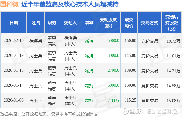 证券之星消息,根据2月11日市场公开信息、上市公司公告及交易所披露数据整理,国科微(300672)最新董监高及相关人员股份变动情况:2026年2月10日公司董事,高管徐泽兵共减持公司股份5000.0股,占公司总股本为0.0023%。变动期间公司股价下跌1.74%,2月10日当日收盘报143.81元。