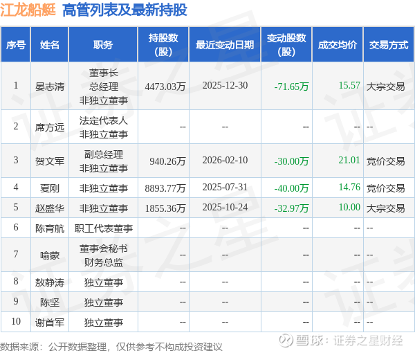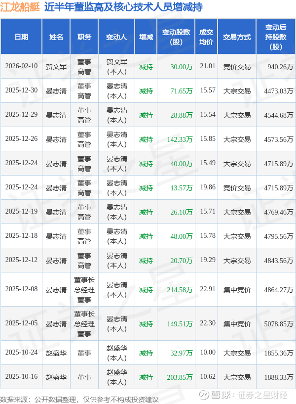 江龙船艇近半年内的董监高及核心技术人员增减持详情如下: