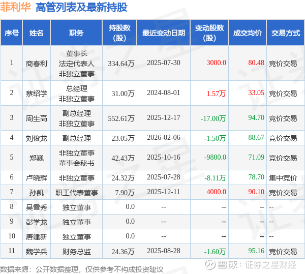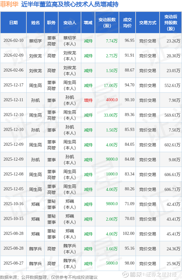 菲利华近半年内的董监高及核心技术人员增减持详情如下: