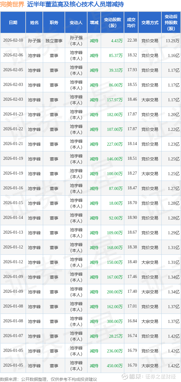 完美世界近半年内的董监高及核心技术人员增减持详情如下: